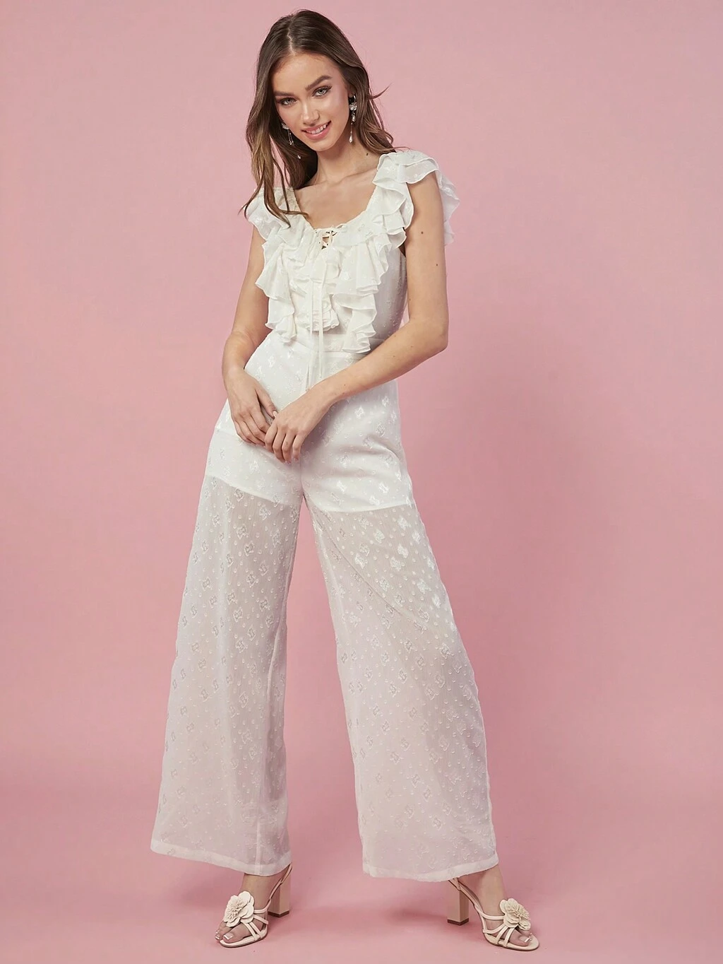 Ladies' Summer Holiday White Simple Solid Color Lace Decorated Cute Bow Jumpsuit For Everyday Wear
