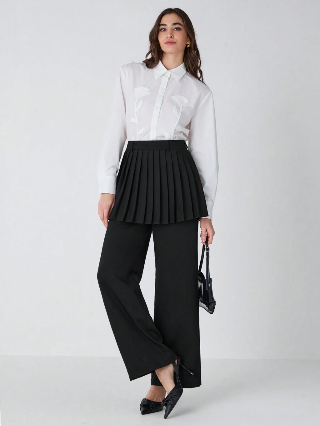 Women's Black Solid Color Commuting Casual / Fashionable Outing / Versatile / Women's Elegant Black Solid Color Patchwork Pleated Skirt Culottes Wide Leg Loose Pants, Suitable For Winter, New Years Clothes, Elegant Women Pants,For Christmas Party&Romantic Dinner Dates