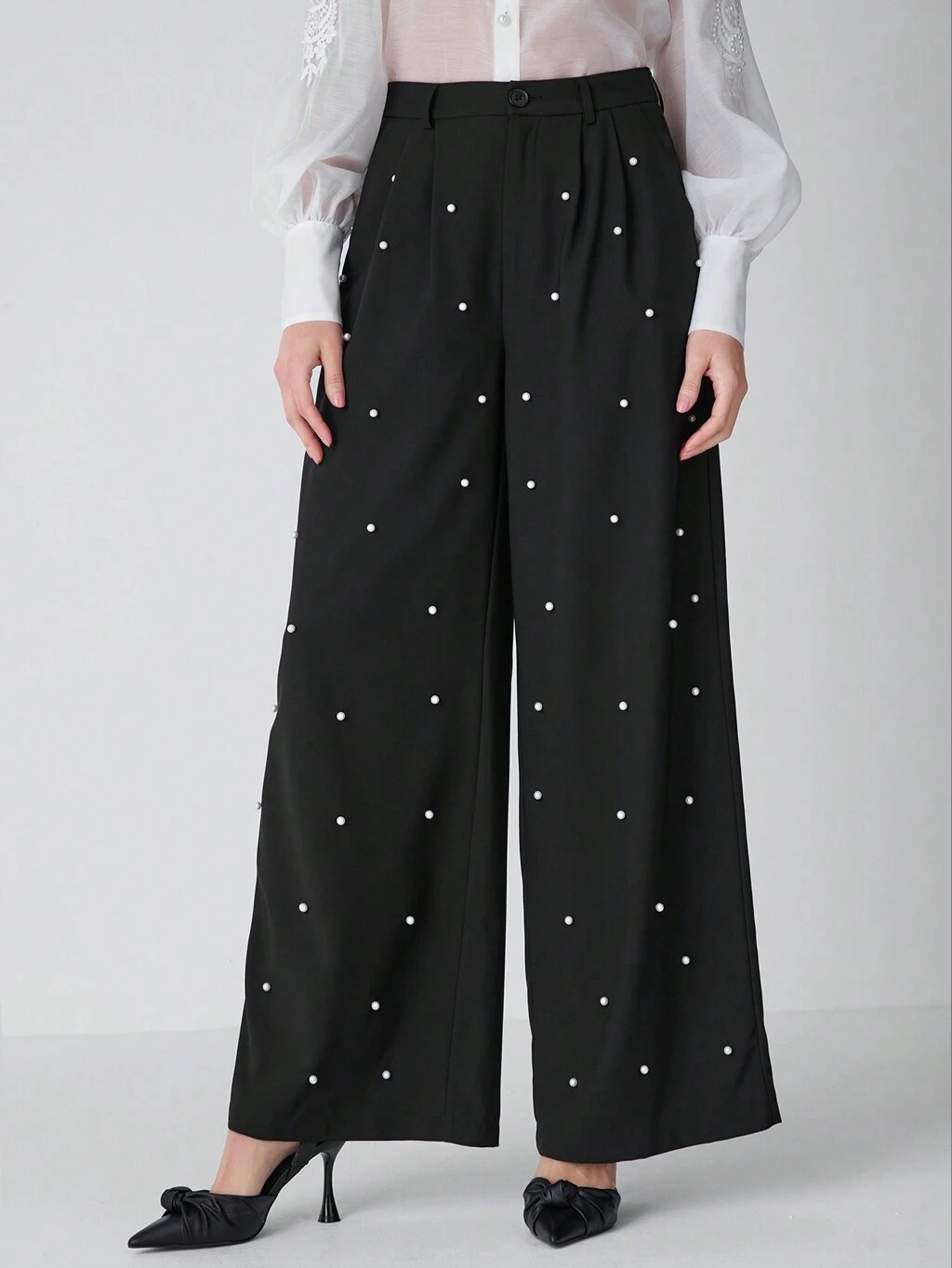 Women's Black Solid Color Commuting Casual / Fashionable Outing / Versatile / Bubble Beads Pocket Loose Wide Leg Pants, Suitable For Winter,New Years Clothes,Elegant Women Pants,For Christmas Party&Romantic Dinner Dates